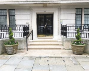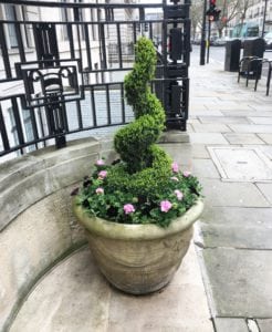 So we’ve been waiting for the nights to warm up a bit so that we can start putting in our summer planting around town. First up, these stone planters outside a residential building in Mayfair, with Geranium, Petunia, and some little trailing purple Calibrachoa still to bloom.
