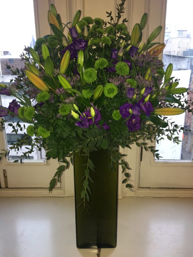 Including: Orange LA Lilies, Purple Eustoma, Green Kermit Chrysanthemum, Purple Limonium with Parvifolia Eucalyptus.